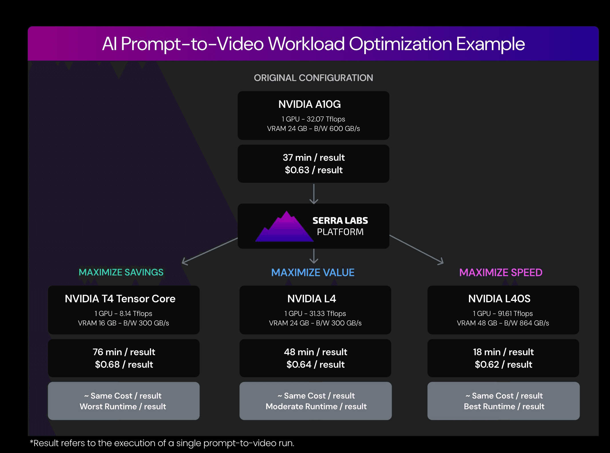 Starting from the original A10G configuration, the Serra Labs Platform searches millions of alternatives and recommends the optimal GPU for each of three objectives. Cost per result is essentially the same across all three — only time per result differs.