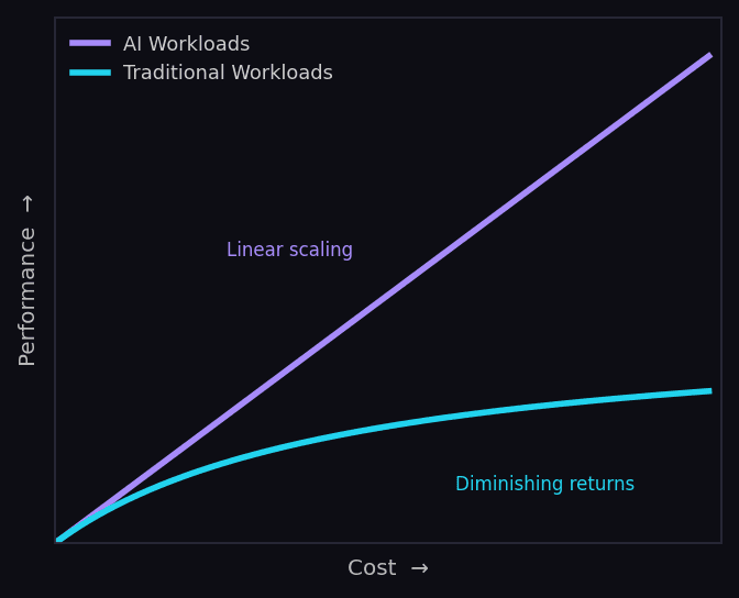Performance vs. compute cost: AI workloads scale linearly; traditional workloads show diminishing returns.